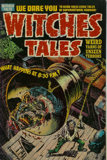 March 2004 : Harvey comics have a reputation for being silly little kiddie books. Richie Rich, Casper, etc. have become forever attached to the Harvey name. There was a time though when Harvey was putting out pre-code horror to rival the quality of infamous EC. Here is a book I bought around the end of 1995 for a mere $20, just before pre-code comics soared through the price guide roof. It is up for debate that this is the best WITCHES TALES cover of the run. For Part One of the HCR Index to WITCHES TALES check out HORROR COMICS REVIEW #3, which lists every story, major artist, and shows the cover for each book listed as well as interior art.