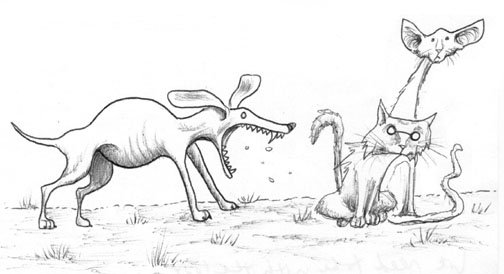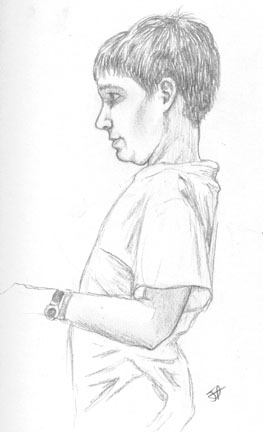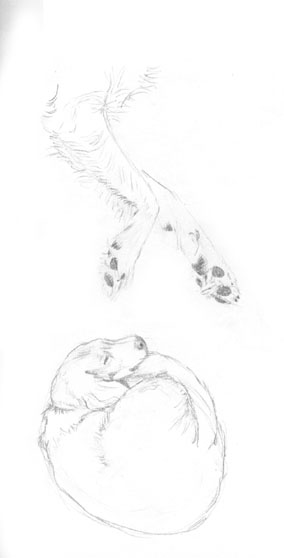I cleaned and vacumed and then went to Bing's. We watched the Italian job and had a big dinner his grandma cooked. The wonderful aroma of beef roast and dinner rolls filled the house and I inhaled it with relish. "Oh it smells sooooo good!" I said as I helped Bing walk out into the computer room. "Eh." He shrugged. I could not believe it! Here a grand dinner was being cooked - homemade grandma food that was practically a Thanksgiving feast - and all he could say was "eh"??? Well, after nearly 2 years of living on my own, you can bet I gave the poor lad a thorough lecture on appreciating the goodness of and time put into an authentic homecooked supper. We stayed up after that and I drew Bing and his dogs, Ipswitch and Nutmeg.