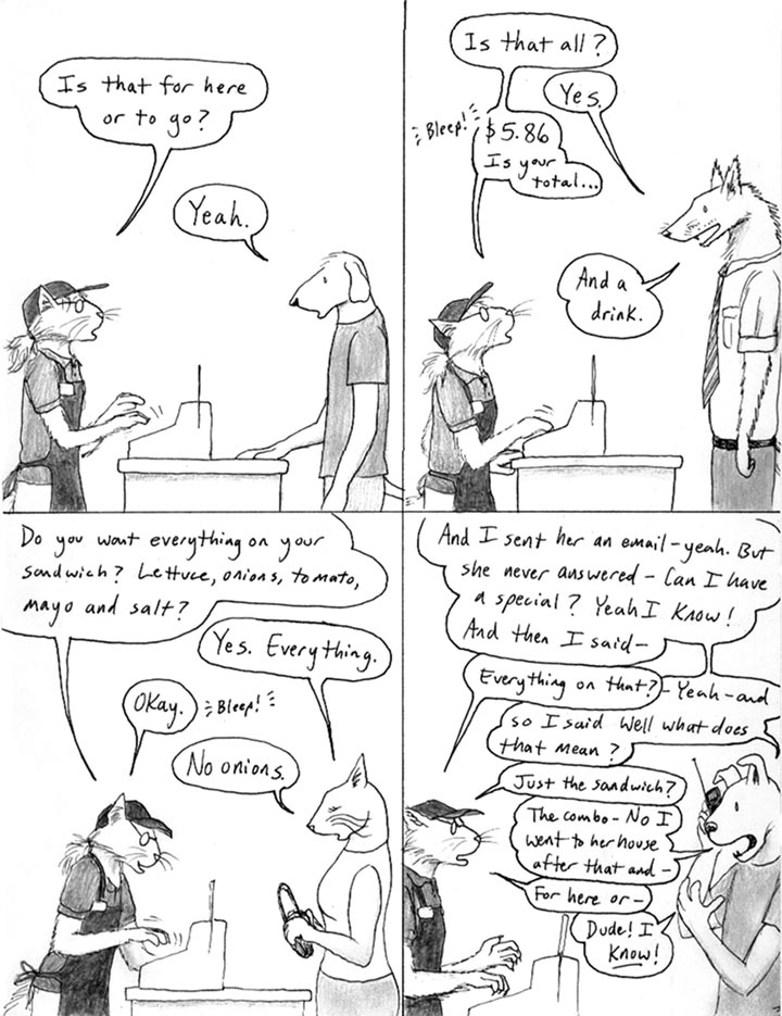Jeanie called me during my two hour break when I was at home and was very excited about volunteering at an animal shelter. I was excited for her because it did sound fun. At work, later, she came in and was very upset - almost in tears. She couldn't find the stinkin' place and had driven for over an hour looking. She was so bummed...I wanted to console her more, but customers kept coming and I had to take their orders. She ended up ordering a chicken sandwich because she was hungry and had given up on finding the shelter in time. I think that cheered her up some, because she said it was really good.