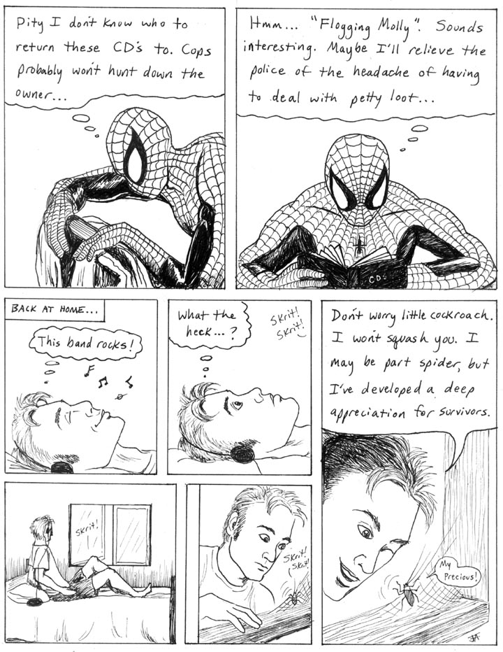 This is for the Annoyed Cockroach who, incidently, had all his CDs stolen and his player gutted from his car today...er yesterday (GAH!). I wanted to get it done so he could see it first thing in the morning, but darn it, I stayed up so late that he is in school now. Ironic. Anyway, I'm still happy with it even though I am on the verge of a coma! Yay! I drew Spiderman! *Thud*