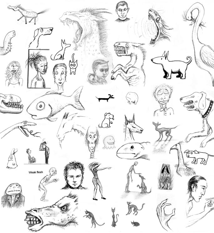These are doodles I've done on homework and church bulletins. I don't know why most of them are frowning or roaring or...committing suicide. I don't feel depressed. Products of boredom from my twisted mind, I suppose. Tragedy and drama, wooo.
