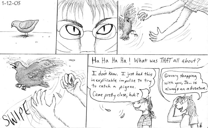 Oh it was an exciting and thrilling day today I tell you what. I woke up and went back to sleep, woke up again and doodled around on my computer. I chatted a bit with Tari, ate some reheated ramen noodle left-overs (YUM), and then dashed out the door to work at the last moment. I got a bill and five or so credit card advertisements which I tore up angrilly (the credit card ads, not the bill). At work Fred got up on a chair and looked at the TV that hangs from the ceiling that shows the surveillance camera and made a big fuss about how hideous the dust was. He announced that it was so thick that he might just throw up and for me to run quick and get windex and paper towels. He went on about how nasty the dust was, and Carol said to ignore him. I guess Fred is the main reason Cousins is such a nice clean place. He can't stand anything dirty about his restaurant. He goes on miniature cleaning crusades when he's bored. He's done the ceiling fans, the little front windows just below the ceilings (enlisting the Shadow's height to help), and he's harped about the filth accumulated in the soda machine and the lack of circulation in the saltine bin. Every once in a while he'll call me aside with such seriousness that I think I'm gonna be fired, and then he'll ask me to compliment him on how well he has painted the walls or tell me to keep an eye out for customers snitching free chips, heh heh heh.