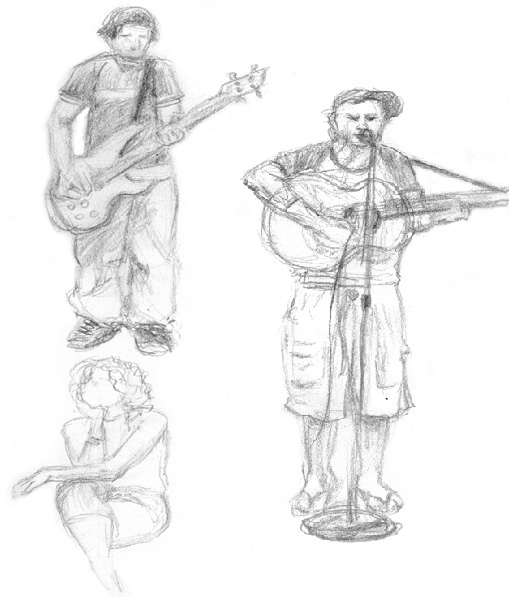Finally I was home and I found Fett and had a nice long chat with him (a pleasant relief). I scanned my sketches of the coffee shop band members and they turned out all weird and skewed. I think my scanner is going to be kaput soon which is bad news all around. I hope it straightens up and acts good until I'm moved into my new apartment and can afford a new one (and a printer too). I may have to resort to cheap looking comics drawn with my mouse in Paint. Let's hope the scanner starts working right again.