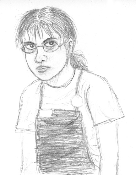 I was just thinking of how all my self-portraits are not smiling, whereas almost all of my comics of me as a cat are. It made me wonder if anyone ever smiles at themselves in the mirror. I consider reflective devices smile-killers. Smiles are for others, not ourselves (unless we are preparing for a photo and are critiquing our silly grins). This portrait was spontaneous. I wanted to draw myself as I feel I look without looking in the mirror. How I remember looking without copying directly. Do I see myself differently than other people? I will ask this fellow sitting next to me (I am typing this at school).