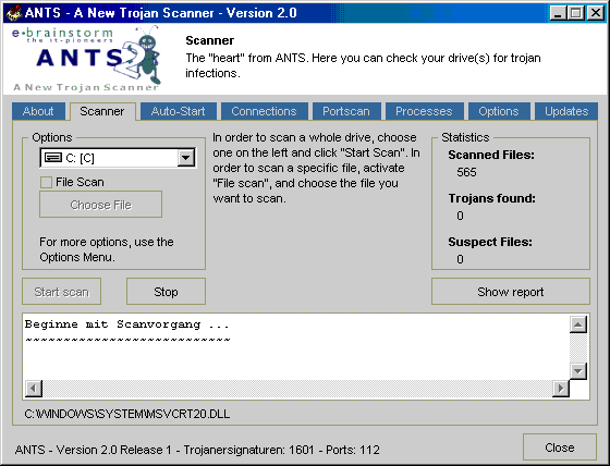 License: Freeware OS: 95/98/ME/NT/2K Size: 1.3 MB ANTS is a Trojan scanner that scans your entire system (or selected files) for suspected Trojans. ANTS finds worms and Trojans that can not be normally detected by the conventional anti-virus programs. In addition, it provides several tools that allow you to monitor connection and application activity on your computer. These include auto-start monitor, connection monitor, port scanner (To prevent & stop hackers), and a list of all running processes. ANTS also includes a memory scan function and ANTS Guard, which runs in the system tray and constantly monitors for Trojan activity. Note: Most of the software interface is in English, but there are some German leftovers. ![]() Click here to download Or Close this page to go back to our site. Please Report Broken Links |