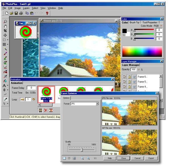 License: Freeware OS: 95/98/NT/2K Size: 6.7 MB PhotoPlus is a fully featured free graphics editor that offers you all the basic functions and more. You can use it to create new images or animations from scratch or edit existing ones, using a variety of brushes and available shapes. The program also supports Layers and Masks. Additional features are Smart Shapes which let you easily choose from a panoply of fully adjustable filled shapes to produce chevrons, hearts, badges, teardrops, moons, zigzags, and many more. The Export Optimizer lets you see how your image will look (and how much space it will take up) before you save it! Its multi window display provides side by side WYSIWYG previews of image quality at various output settings. Furthermore the program lets you create HTML image maps and also slice images into multiple parts using the visual slicing tool. Additional filters and plug-ns can be downloaded as free add-on packs. Overall PhotoPlus is an excellent (and probably the most complete) free graphics editor that will by exceed your average editing needs. (Requires free registration).