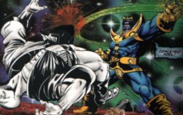 With little pause Thanos left to confront the effects of realities which most beings, and some Gods, cannot survive. He passed through each of these on his way to the current prison of the Soul Gem and its bearer. Upon arriving in the Nexus of Realities he found this being trapped in a sphere made by Chaos and Order, also being guarded by a squadron of guards. Thanos' chair/ship quickly dispatched of the guards in a single shot, which left him to land before the In-Betweener. Here the Titan spun a web of tales, telling the In-Between that he wished to leave the service of Mistress Death, but would need someone to protect him from her. The deal was eventually struck that were Thanos to free him then the In-Betweener would aid the Titan... these were, however, dual misleadings. With a combined effort the prison sphere was shattered and the captive released. His first action was to attempt to double cross Thanos by firing a blast of his deathly powers, yet Thanos knew the powers would not work, for they were in the Nexus of Realities, there was no opposites here, only the lack of all such things. A single punch from the Titan forced the In-Betweener into a state of unconsciousness, and Thanos easily removed the gem from his forehead. From here the Titan abandoned the In-Between the the approach Lord Chaos and Master Order, that they would punish him even furthur for attempting to escape (Recall that Thanos is outside the influence of Chaos and Order, and they cannot detect his coming or going). Next was the Power Gem, which was in possession of an Elder named Champion.