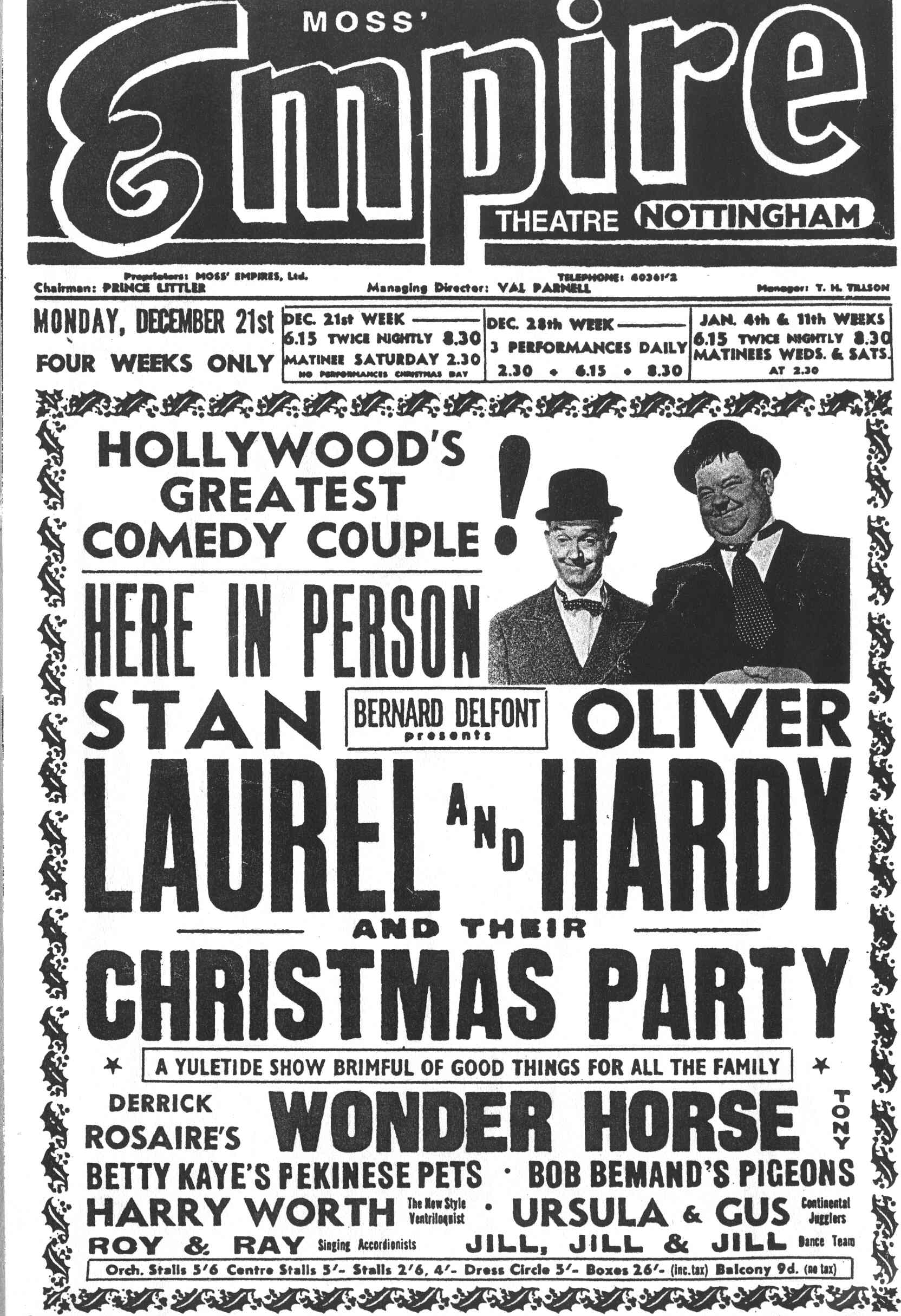 Stan and Ollie visited Nottingham twice during their British tours. The first time was at Easter, 1952, following a week in Leeds. On the week commencing April 14th, the Boys appeared at The Empire Theatre, Nottingham.