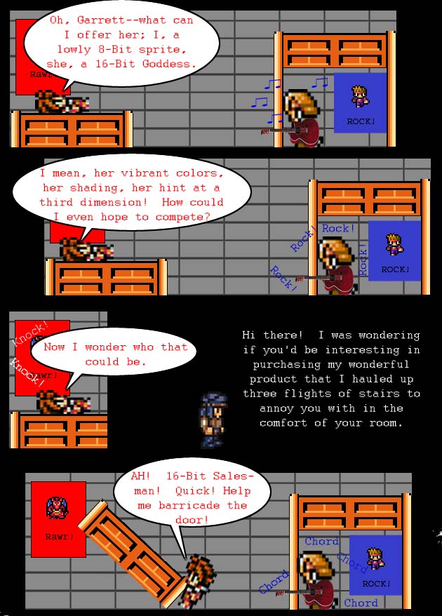 Mike Says: Directly after that last frame, Garrett did some wicked guitar stuff and, reminiscent of all those 80's metal videos, repelled the salesman with the sheer power of his rock.