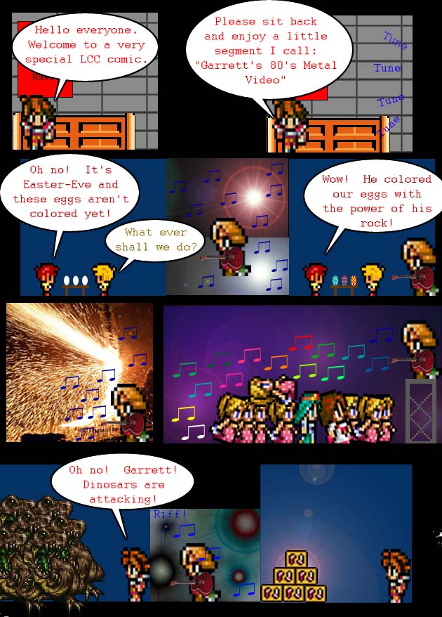 Mike Says: Astute viewers will notice that this comic successfully captures all the vital elements of metal videos in the 80's: Garrett is capable of altering the physical properties of objects through the sheer power of his rock, there's dancing girls, and a factory producing nothing but sparks. Also, this gave me another blatant excuse to use the dinosar picture.