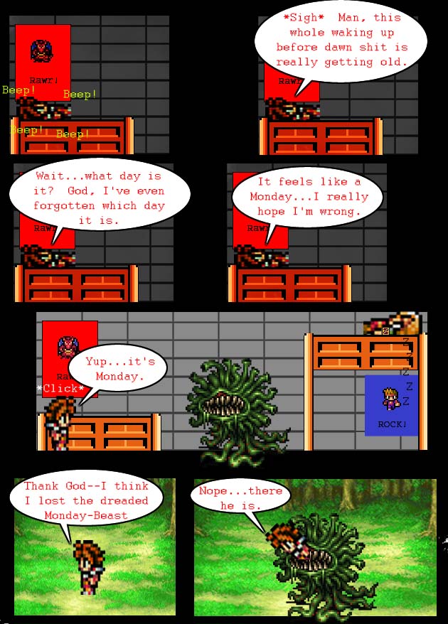 Mike Says: This comic idea I blatantly ripped off from a conversation in which the term "Mondayoscity" was dropped, whereupon I began imagining Monday as a viscous liquid, which then quickly turned into a monster chasing people around. The comic was solidified when I began to share this thought, and the creator of Mondayoscity chimed in, without even a second of forethought, "Monday needs to have tentacles."