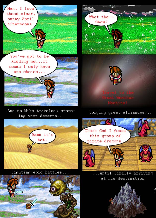 Mike Says: This story is actually much more tragic than my PG version would let one (kids' show and all). There was a battle against a rare breed of cacti in the desert, which bled water, so it was only by slaughtering villages of them that I managed to survive. The dragon-pirate ship was brought down off the coast by a sea-beast, and only I and Snappy survived (poor Snappy...he had to be eaten for nourishment by the tenth day...Snappy, you were delicious). I met Danish in a seedy bar/brothel, where he decided that my quest was noble enough to swear off his nights filled with alcohol and prostitutes and join me. However, after we'd managed to survive the dinosuar and floaty-eye thingy, he was killed in the pass by a rock-slide. Danish died a pure danish, though.