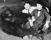 The rest of the movie involves them trying to sneak the gorilla past their hotel room's manager (Billy Gilbert). They also try to avoid the circus's wayward lion, who unconvincingly chases them during their escapades. (Stan and Ollie run down a path, then the movie conspicuously intercuts a shot of the lion roaming the same path. Not exactly enough to strike fear into moviegoers' hearts.) The funniest moments involve H.M. Walker's intertitles ("The night was dark--they usually are") and a lion-chase moment where Stan tells Ollie, "I just saw MGM!" The rest is pretty mechanical stuff, especially when the manager hears L&H talking to Ethel the chimp and thinks they're having a menage-a-trois with Ethel his wife. Something about the incongruity of great movie comics with guys in chimp costumes (remember The Marx Bros.' At the Circus?) practically screams out desperation.