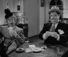 After Vivian Blaine does two elaborate musical numbers (which, in best big-studio style, supplies her with six dancers to supplement her simple audition), we get back to The Ever-Expanding Plotline. Malcolm Bennett (Douglas Fowley, one of the more believable L&H/Fox gangsters), the man who fleeced Susan's mother, needs backing for a show he's producing. For no compelling reason other than another excuse for dress-up, Chester gets Stan to pose as "Aunt Emily," a wealthy childhood sweetheart of Col. Bixby's. This does yield a funny scene where Ollie shows Stan how to walk like a lady. (Somebody ought to have Stan and Ollie do some funny stuff like this in character.) It also inspires one of L&H's infrequent but surprising double-entendres, as Stan blurts out at one point, "I feel so gay!"