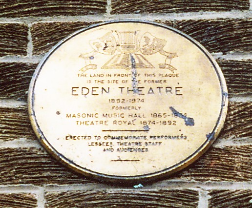 "The land in front of this plaque is the site of the former Eden Theatre 1852-1874". Seen from Theatre Corner, nobody would know A.J. owned this little plot of land, and that there was once a theatre here. The theatre was originally called the Theatre Royal. A.J. eventually sold his interests in the Eden in 1927.