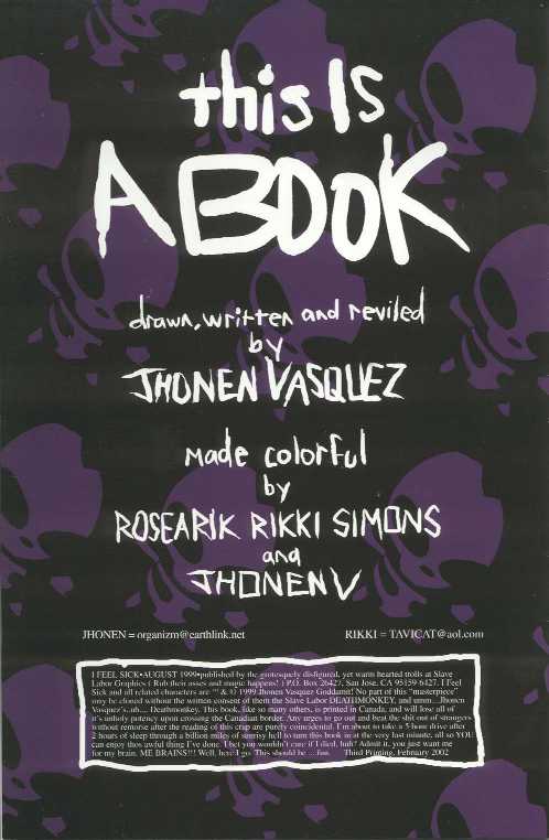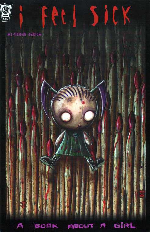 | I Feel Sick: A Book About A Girl takes the opposite half of JtHM's qualities than Squee! It's quite serious, and the plot is close to JtHM, minus the, ah, killing people. I Feel Sick actually takes a far different turn than the rest of Jhonen's works. Not only is it in color (thanks to Rosearik Rikki Simons) but it is also one continuous story, rather than several vignettes. Granted, it's in two books, but it was originally going to be one. The plot revolves around Devi out of JtHM. It takes place after JtHM #7, and she gets her own little brain leech, just like Johnny!