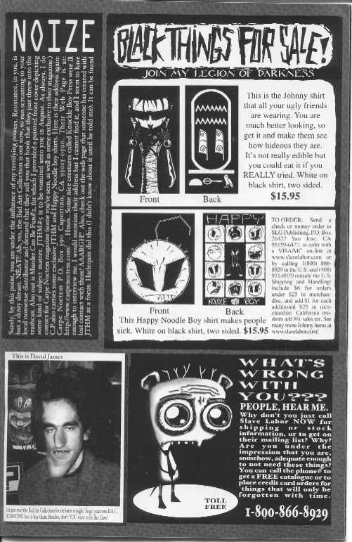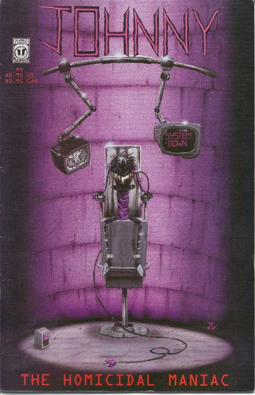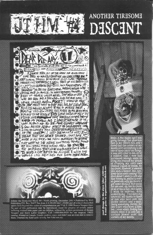 Cover Ah.. This one is very think-making. Those with small brains should approach with caution. "Descent" This one is VERY heavy on dialogue. It's really important dialogue, too, even the "badly constructed melodramatic prose." Because Johnny is finally beginning to realize what's really going on. What's happening to him. Aaaand... who's doing it. It's vital to the overall plot of the series. And also, it makes me just want to give Johnny a hug. Bob, whose head be wobbly. ooh. I like this song. XO! "These are not good times to be near me" I don't know if that's the title or not. Anyway... Nny goes down into the basement, meeting Tess and Dillon, who are chained to the wall. And guess what room they're in. ... Well, that's half right.. It almost is a room with a moose. But Moose is still in the wall. Nny and Tess talk about the horrible things he has done... and she makes a stupid assumption which REALLY pisses Nny off. Then he quotes The Fly. And we meet.. Mr. Samsa!!! xD. Nny pays a visit to his little neighbor. He needs a band-aid. "A Call". Devi's back, and looking MUCH less annoying. She and Tenna are discussing her last date. I think we can safely say that she is traumatized. But.. Tenna convinces her to call him.. and it's unpleasant. Gunshots, screaming, etc. ick. Meanwhile... After Breakfast. Ah. A very very very very very very clingy little boy, and a mother who must get to work. Public Service Announcement. Drugs are bad. So is running away from home. In this one... Johnny is interrupted by one of two things. Either the ranting thing is himself, or Jhonen putting himself into the comic.. I don't really know. I think it's Nny though. It's all very depressing, either way. "A Call?" Johnny goes through another suicidal time. He's set up a robotic arm with a gun in it and a tracker. When he lifts the receiver of the foen, the gun will follow him. However, it won't fire until he talks. However, D-Boy makes a valid point by saying that no one's going to call him, and that Nny lacks the courage to off himself. Finally, Nny shows some control and knifes D-Boy, which I applaude. He also tries to turn off the arm... but.. it was never on. Which means that he has now turned it on. Which means.. Bad. Because just then, the foen rings. (Anyone paying attention would know who it is.) HNB! He sits on heads today. Johnny states the obvious. |