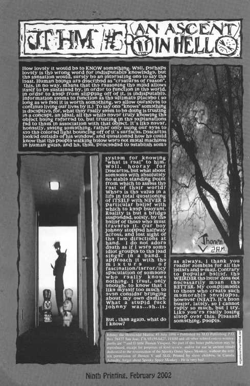 ![]() Cover Whee! I finally have this one! Nny is not in it much, actually. Mostly, it's Tess and an asshole named Krik escaping from the depths. Oh yeah, and the end of the world. An Eventful Day begins with Tess and Dillon in their little room. Tess sees that something is coming up from in the floor, and also that the house is shaking quite a bit. We are then not so very pleased to meet Krik, a bald moron whom I find... assholish. He works to free Tess, despite... sounds. He would have helped Dillon to, but Dillon's fate is sealed. The panel in which he is torn to shreds is very nice though. Then, they run. Wheeeeeeeeeeee!! Bob of the wobbling cabeza. He moves. Curse JV and his nameless comics! Tess and Krik continue to flee. Luckily, Tess has a few revelations, redeeming her character in my eyes. Krik, however, slips down a few more notches. We hear of how he was captured, and we get a peak of amazing asshole-vision. Bwie. Our two little runners soon find themselves in a room full of tortured people. Eughk. Then they get put out of their misery. Meanwhile... The Little Girl Eats Her Candy. And I write this a few hours after trick or treating. Yes... the little girl is eating her candy. She is Mexican, I presume, as she is visited by a few rather... interesting piņatas. Call me wussy, but I actually found this one... creepy.... .:: shiver ::. Talking to Styrofoam. So informative. Tess's willingness to accept her flaws is impressive. Krik has not improved. Then they meet our two unrecyclable friends!!!!!!!! YAY! .:: waves ::. They explain SO much. They really do. Some very intesting shit. Then D-boy gets his wish. We now meet Anne Gwish. Goths suck. Sorry, but they do. Or at least, the stereotypical fake-named, black-haired, pale-faced, nihilistic do. They are great to laugh at though. :9 The most beloved massive head wound recipient in existence!!!! HEDDO! We all missed you, Nny. Krik earns the true status of "overwhelmingly assheaded dickless crotchscratching fruit" hear. We all hate him I'm sure. I mean.. what he does... to a DYING MAN. Fuckwhore. (Did you see all those compound words?! I am so SMART!) ._. Nny.. he says some fascinating things. And then we applaud Moose. Then the world ends. c.c I still don't quite get it... Happy Noodle Boy: The Movie. French! I do love these final pages... They are difficult to summarize, however. |