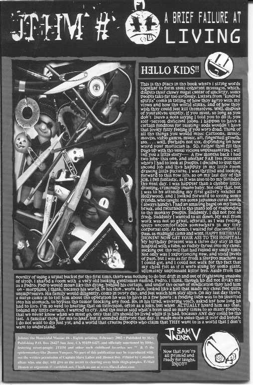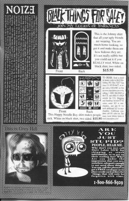 Cover This is probably the funniest issue. I love it. It's HILLARIOUS. But, it's also got its share of interesting things. Jhonen's versions of Heaven and Hell are interesting. Funny, yes, but interesting as well. Hm. This one has no name. Nny finds himself.. in heaven. He is intruiged. He begins speaking with an angel. Ah. I'm really tired of these. Oh well. He asks the angel to fix his head wound, and is given.. a band-aid. But, it WORKS. Wow. Then the angel looks up Nny's files and is violently ill. Nny moves on, and meets... God. Really. Not what he expected though. See... God's a fat little old guy in a chair. Sleeping. Nny wants to ask a few questions, but God is sleepy. Then we jump to a COMPLETELY unrelated comic, but it's just so very funny. xDDDD Nny acts so cyoot. He's all.. drilling this guys head, And well.. buy the damn thing. ROFLMAO. Back to the normal plot, if it can be ocnsidered normal.. hehe. We meet Damned Elize, Nny's guide for his stay. (of course he doesn't get to spend eternity in heaven. Duh!) She explains most of what's going on in heaven, why everyone's just sitting on their asses, why she isn't, etc. All is fine... until... she tells him that he has the power of HEAD-EXPLODY!!!!!! Who HASN'T wanted that power? So, anyway, one can guess that he doesn't just sit there and keep his power to himself. No, he shares. He spreads the fun. It's all very funny. And chaos is caused. Nny's in troouuuuble!!! And then he just goes a little crazy, and then- FOOF. He's gone. Meanwhile... In an Autobiographical comic! So very funny, this on is. Jhonen! Jhonen desires Ice Sucky. So, he flies out of his castle on the mountain and down to a Roachy Mart. However, oh so sadly, teh Ice Sucky machine is turned off. Jhonen is depressed. But then, he realizes that the clerk is the Devil. The clerk is forced to transform into Satan. He looks awesome, too. So, anyway, there is Stanic Head Bitey, and flicking off, and things.. :3 And now for something completely different. Johnny has "Foofed" straight to Hell. Yay! He meets Senor Diablo, and finds out that he doesn't belong in Hell either! Sucky, no? Because, this means he has to go back to the land of the living, doesn't it? Ick. So, anyway, Mr. Devil takes him around a bit. He also does him the favor of explaining what exactly has been happening. I still don't quite get this part, but I understand it well enough. I'm not going to spoil it though. No, I certainly am not. I don't want anyone to get mad at me for spoiling things. WHB. I can't really think of anything witty to say here, so I'll poke you. .:: pokes ::. GAH! ANOTHER nameless one. Nny meets up with a guy who's supposed to take him around. The guy is pissy, too, and he calls Nny a girl. After Nny explains that his name is Johnny, not "girl," the guy recognizes him... After all, Johnny KILLED him. He goes all ranty on the poor maniac, so Nny pushes him out of the car. b! Anyway, Nny finds himself in a store. He wants new clothes. Sadly, he learns that he needs MONEY. Johnny thinks that this is very stupid indeed. So, he kills the clerk and gets new clothes. You know... I am getting REALLY sick of writing these. So.. yeah. He learns why everyone's all stupid like that, and it's all very nice. Johnny's hair looks neat. Anyway, he meets back up with the Devil, now in the guise of a cheerleader. She/he would LIKE to tell Nny about his origins, but Nny's too busy obsessing over his coat. Then, poof. Or, actually... ZZT! Johnny the Resurrected Maniac. He's back!!! And the world exists. He's sporting a new outlook, a new life, and a new haircut. :9 Still insane though. Happy Noodle Boy!!! Fun with traffic. Johnny writes about the day. |