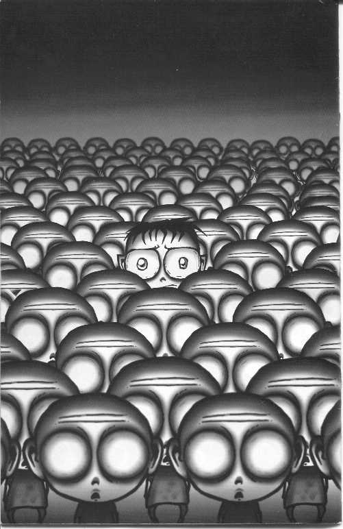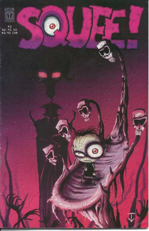 | Issue #3 I'd like to start this one with an amusing anecdote. However, I have none. So. My mom had decided for a while that she had to "approve" my comics before I bought them. I showed her this one, and it nearly failed. Why, for all reasons? Because it had upside-down crosses at the end. u_u; WELL. Obviously I got it after all. Just before bedtime. @_@ my baby is falling apart!!!! .:: hugs it ::. anyway. Squee comes downstairs, screaming for a father that does not care. (note the book titles on the shelf: "How To Abuse Your Kids and Not Beat," "Living with Spite," and "Coping with Hate") Today's concern is dust mires. Squee actually makes them out to be quite creepy. o_o .:: suddenly frightened of dust mites ::. no no, I just kiddin'. He receives the standard response, sadly. Squee goes upstairs to his room and begins to rid the premises of the dreaded dust mite. However, he gets a nasty giant dust-mite-shaped surprise when he shakes his pillow. The insect falls to the sidewalk and cusses Squee out. He crashes his way upstairs and starts ranting at out bite-sized hero. Omfg I have a sudden urge to read JtHM REALLY bad. u.o Anyway, he and the mite duke it out. Eventually, the mite begins to feel the effects of Squee's secret plan. YAY SQUEE WINS!! Or... did he? The Space Monkey Who Loved Me. K, this is a little comic by someone who is NOT Jhonen. Actually, it is Danette St. Onge. She is the reason the Demigod Happy Noodle Boy existeth. Apparently she was a girlfriend (or maybe just friend, I'm not sure) of Jhonen's who always asked for comics. He decided to create the absolute worst comic he could, and that was Happy Noodle Boy. :D And so today's Jhonenhistory 101 lesson concludes. The actual comic is about a little girl (Danette St. Onge) who goes to the zoo. A Little Visitor. You do realize I'm doing this out of guilt, don't you? Well, in case you didn't, you do now. Anyway, Squee was sleeping, but he awakes to discover that he changed positions in such a way that he is now facing the wall. Just like I did back when I needed to have my bed against the wall for security, he feels vulnerable. He turns, if slowly, and sees a young looking spectre, prompting him to turn right back around. It turns out that she met her demise in his abode. (Okay, enough thesaurus for me. XD) How did she die? Let's say it involved Boompy the Dog and Mac Donalds. Moral of the story... READ WARNINGS ON HAPPY MEAL TOYS. Poor Squee. True Tales of Human Drama! Poor sneezy man. A Breif Friend. o_O JHONEN MISPELLED SKOOL!!!! It says "scool" and that's just wrong! Oop. Anyway, Squee is getting pushed around. Literally. Poor baby. ._. He soon meets an absolutely ADORABLE dog. And I mean that. He regrets that he cannot take the little doggy home, but... things around little Squee seem to "go really bad"... He does the dog a favor and throws a ball for it sadly. Then, it becomes a little tasteless by some standards. Doggy get ball, doggy get runned over, doggy gets up, doggy get runned over, doggy get up... MEANWHILE! A horrible film directed by Jhonen Vasquez. You have no idea how much I would love to see a film like this in theaters, just to see the reaction of America. .:: mad giggles ::. I guess that was really the point of the comic, but still. Satire is so fucking delicious. :9 (although in this case, admittedly icky.) Dinner With Satan. Squee comes home and is told that he is going to have dinner with a friend. GUESS WHO IT IS!!! Hey, NEAT. You got one right!!! Pepito it is. So off they go, and Squee is ejected at his friends house. u.o I REALLY don't feel like doing this any more. @_@ No, no, don't pay attention to my agony. Just enjoy the damn summary. THE DAMN SUMMARY MADE OF MY SWEAT AND BLOOD AND- .:: deep breath ::. okay.... okay. So yeah, his mom comes and welcomes him. Pepito comes downstairs, and greets Squee, er, Todd. Blahblah he shows him the basement full of ghouls and hell and stuff. And his Dad comes home. Argh, Satan looks so DAMM COOL. ;-; I'll never draw that well. OKAY I NEED TO FOCUS!!!! There's a breif discussion before they sit down to dinner regarding the meal. (Toasty souls of the Damned, or Stove Top?) Squee is now TEMPTED!!!! BUM BUM BUM. However, this right here is why my mother in fact allowed me to buy it. Happy Noodle Boy! Now that we know of his origins, perhaps we can understand him more fully, eh? Yeah I know that's bullshit. This one involves baseball bats. DREAMTIME! It's benign. |