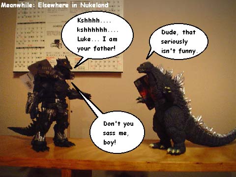 THIS IS NOT A FILLER! I DENY THOSE ALLEGATIONS! It actually has something to do with future plot. It's alot funnier to people who know though... and those are a couple of my new collectibles. A 9" 2004 Black Mecha Godzilla Theater Exclusive, and a 2004 9" Godzilla. This comic was shot at 3 am.