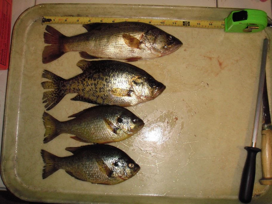1 Largemouth Bass, 1 Black Crappie, And 2 Bluegill caught by me at St. Louis Ponds.