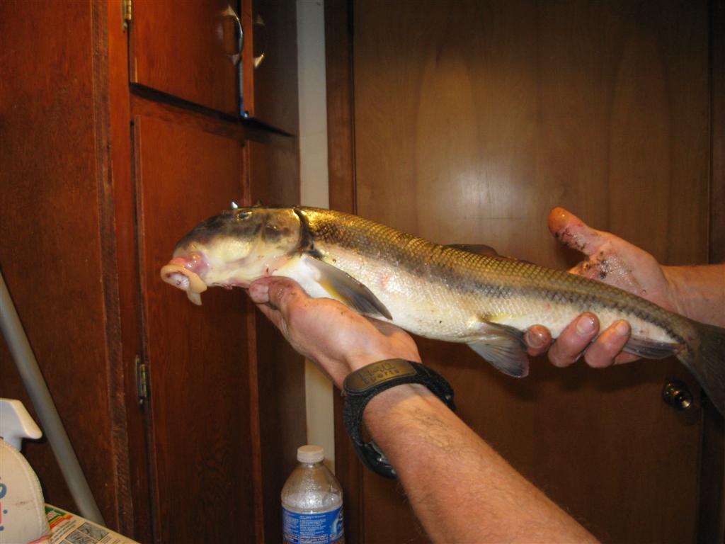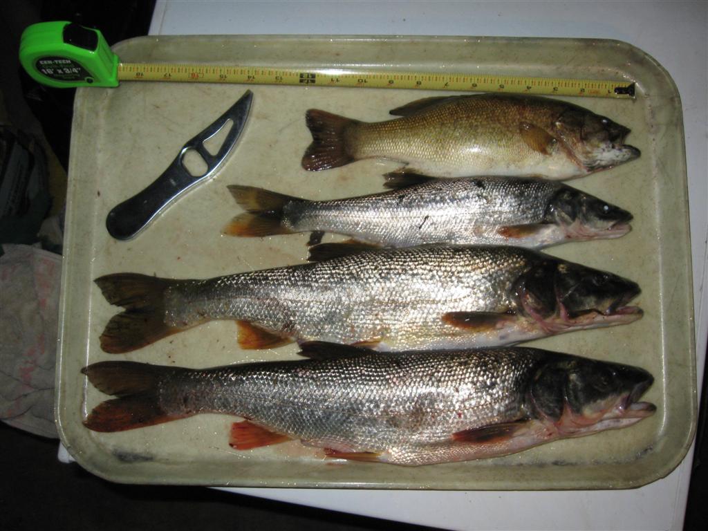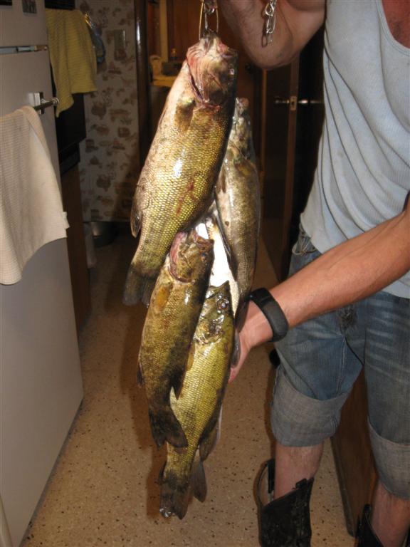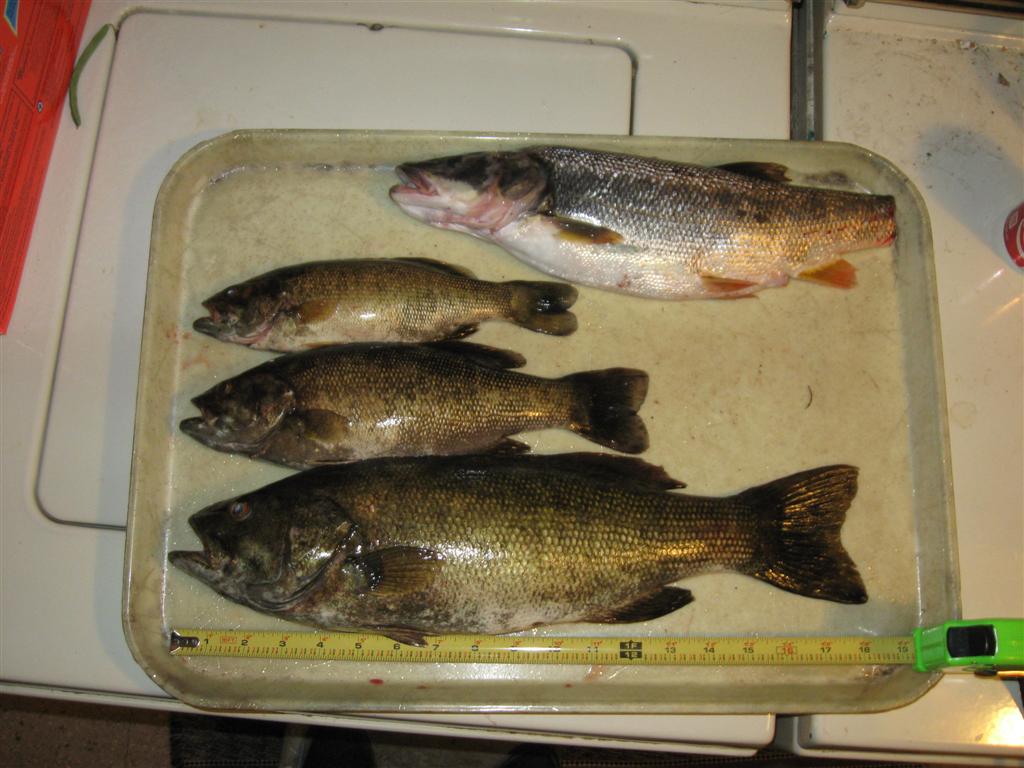 4 Smallmouth Bass, 1 Sucker, and 1 Squawfish (Northern Pikeminnow) caught in the Willamette River. (The Sucker and the Squawfish are for crayfish bait.)