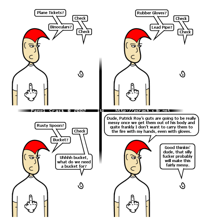 BulletinIf you don’t know who Patrick Roy is, then you probably won’t get today’s comic. If you aren’t a Redwings fan then you probably won’t either. If you aren’t into hockey at all, but want a basic overview of what is happening right now, click here. All those who are in the know may continue reading, everybody else… fuck you and see ya tomorrow. Ok so I’m calling on those of you who are left to go to this site: http://www.freep.com/photos/wings_voodoo/. Once there you can print the makings for your very own Patrick Roy Voodoo Doll. This is the same thing that was printed in the Free Press before the Avalanche series started. I’ve been waiting to break mine in, for fear it would be used up by the time they really needed it. The waiting is over though folks, the Wings absolutely need everyone out there to torture their Patrick Roy Voodoo dolls. In fact I’ll consider it a personal favor if each and every one of you demolishes one during tonight’s game. If it all works and the Wings end up winning tonight I will post up a pretty awesome desktop wallpaper of Yoda with a lightsaber, maybe even two of them. This isn’t like a drawing either, this is a crystal clear digital quality film capture straight from Attack of the Clones. There aren’t any of those pesky copyright bullshit lines on them either, so it may not be available for a very long time, but you’ll get it here first. So remember, go to the site: http://www.freep.com/photos/wings_voodoo/, print out your Patrick Roy Voodoo doll, destroy it during the game, and if the Wings win you get not one, but two special custom Yoda with lightsaber wallpapers.