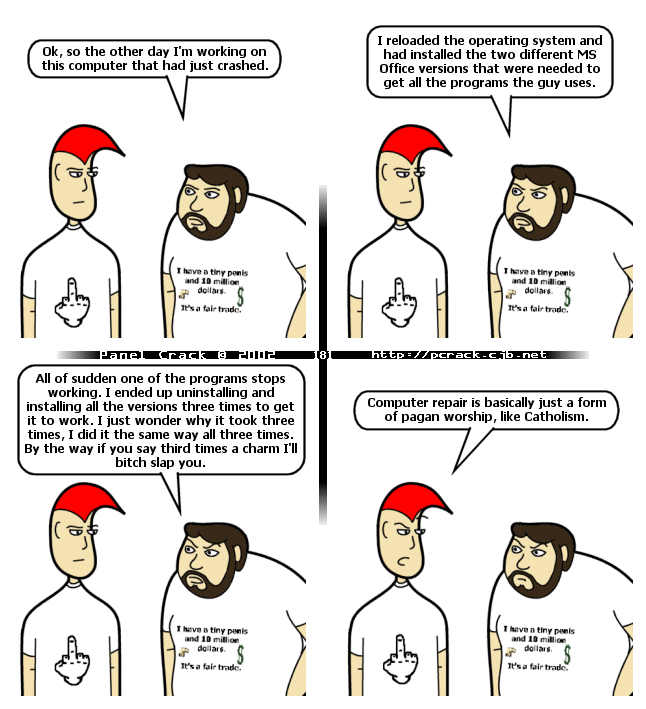 Note to readers: If you bookmark this site, it is best to bookmark pcrack.cjb.net, just in case this host goes down that is a redirect url and it will take you to wherever I put the newest comic. © 2001, 2002 I scream, you scream, we all scream for crack.