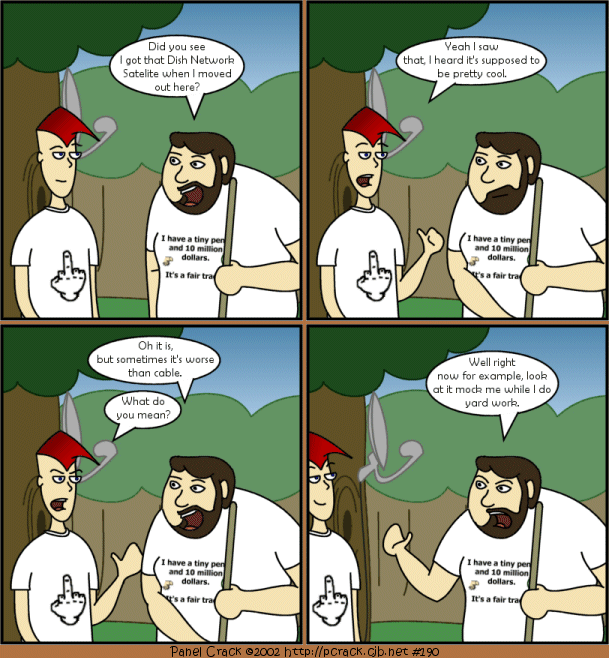 This is just so true to me right now. Every box. Every piece of furniture. Every item too large for a box, yet too small to necessitate multiple people carrying it. Basically everything in our new apartment was a pain in the ass to move in. We are on the second floor so that sucks. It was also swelteringly hot every single day there was lifting and carrying involved, so that added its own complications. The worst part for me though wasn’t all that, it was looking at that damn satellite dish. I was working my ass off and it just sat there and stared at me. As if to say, ‘Ha, Ha, You poor bastard. You are paying for me to sit here and not fill your head with the mindless garbage that you crave.’ It was... to quote Method Man, ‘Torture motherfucker, torture.’ Hey but now that’s over and I got a comic out it. To those with cable or without a TV addiction, you’ll never understand.