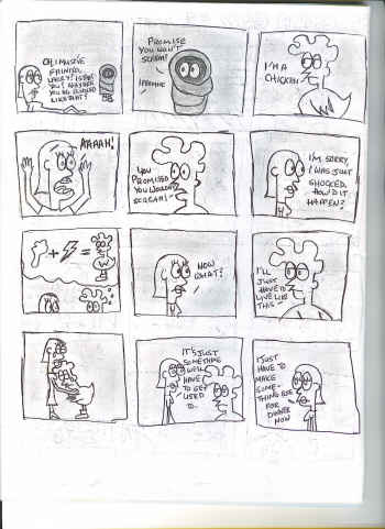 *artist's note* I was too lazy to write the whole fried chicken/lightning thing again, so I just drew it as a thought bubble w/pictures.