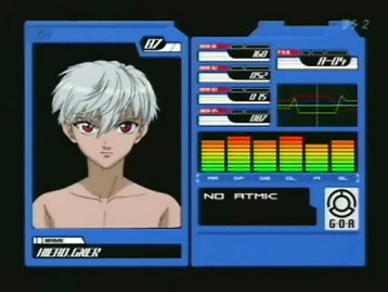 Well I guess you could call Hiead our "angst" character. (Kind of like Matt in Digimon 01 and of course Kai in Beyblade) He is tagged candidate #87 and appears to be very cold and cruel especially to his repairer. He doesn't want anyone to "get into his head" as he puts it. Zero irritated Hiead from day one so the episodes center around quite a bit of competition between these two candidates. As with most angry characters, a flashback reveals Hiead has had to endure a tough, violent youth. Hiead was very jealous that Zero got into a Ingrid before him and constantly tries to outdo Zero at every turn. It is also interesting to note that Hiead has the same EX level as Zero, although everyone is supposed to have different levels. Nobody likes to get close to Hiead because they are afraid of him. We dont know anything about his past, except that he has recurring nightmares about his childhood.