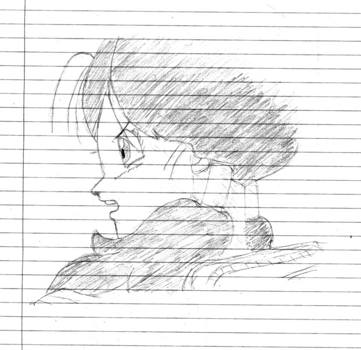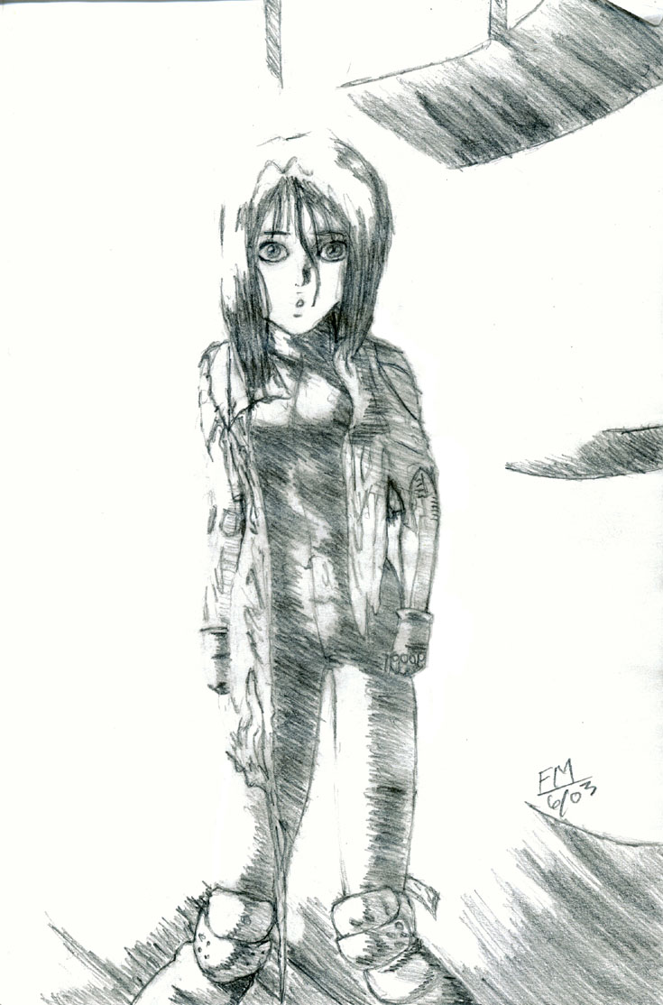 Alita - My first sketch in a couple of months, most of it done while mostly in a sober state. There was a scene in "Tears of an Angel" that I really liked, and I decided to just draw it. I really liked the way this one turned out, as I got to really play with the shadows from the scene. I never done that much lighting influenced stuff before, so hopefully I can do more. Drawing was done on a 6 x 9 writing pad with a HB writing pencil.