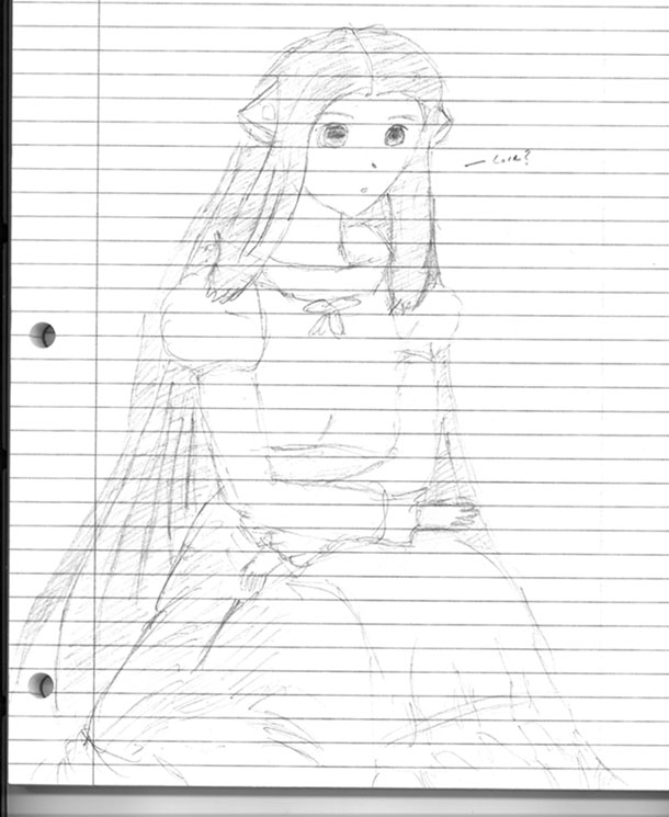 Corebits - Well, I starting on some cosplay drawings, and I told 3V1L BR4T that I would do her as Chi from "Chobits". This is a rather rough sketch, but I liked how it turned out. Note the funny little quote there, which gives a clue to the insanity that is "Chobits". This was drawn on a 8.5 x 11 yellow writing pad with a HB writing pencil for my tool.