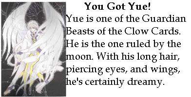 Yue is the Guardian Beast of the Clow Cards that is ruled by the moon. He is the one that passes judgement on the Card Captor(s). In reality, he doesn't have a gender, however, we fangirls like to think that he's male. After all, he has a male's voice, and he looks ve-ry bishounen.