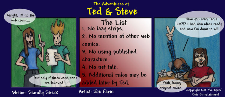 6/26/2003Epic Joe makes an Epic Appearance! Yes, I'm in today's strip! How about that? Four strips in... We're finally getting rolling, net complications and all. I'm back and ready for the weeks ahead, though. I hope you all stay tuned, as we take a new turn pretty soon, introducing new characters and upping the insanity factor. Don't hesitate to write and tell me how much you love the art! Until next time! -Epic Joe leaves on an Epic Quest- |