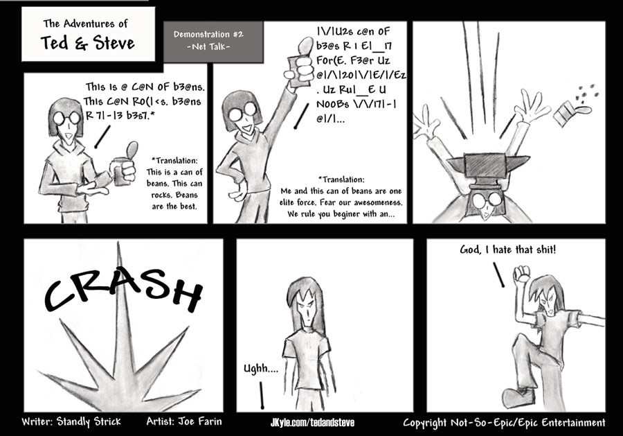 7/11/2003Well, better something then nothing. I really wish Joe had the time to do this one in color. It just rocks. Well hopefully we get around to doing some remakes of a few of the strips. Also really special note on this one so check it out. And finally there should be an interesting pic up this weekend (The Adventures of Ted & Steve related). Oh, and Loony Tune action strikes, Booyah! Steve sent me a message that I can only think confirms Xenosaga's badassness. Albedo is the f'n man. 7/13/2003 Art update. Well it's a preview of the upcoming story arc for The Adventures of Ted & Steve, so not realy an art update. Sorry for it not being up this weekend. Just got lazy and needed to ok a few things with Steve and Joe about the pic. And just so you know, I colored and lettered it. So for the few that read, sit back and wonder what’s going to happen next. All that said Fuck Armada - Standly "The Not So Epic" Strick of Jkyle.com |