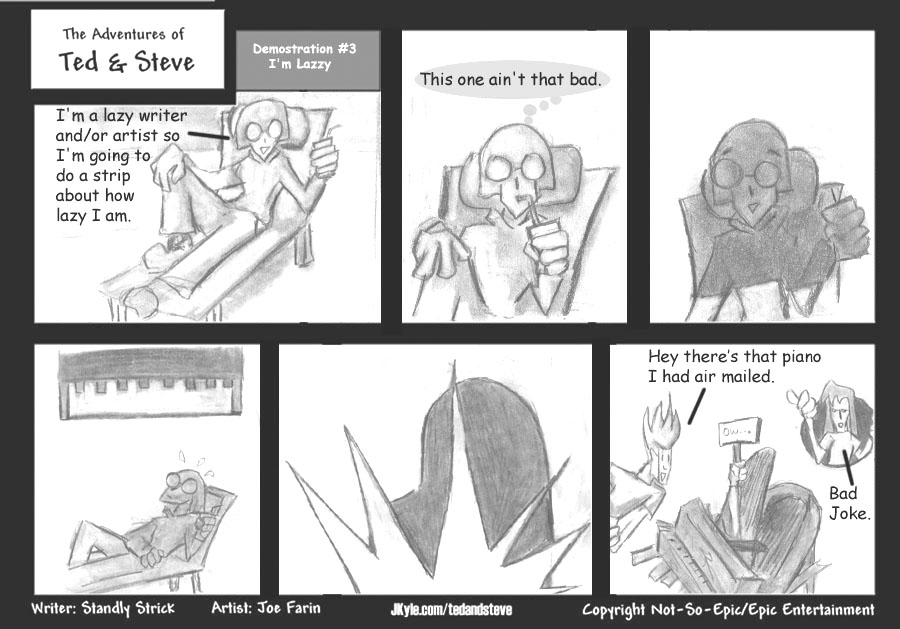 7/18/2003First Joe gave me the drawings to scan and put into the strip. I'm not good at this so you get a crap job. Also I thought of fixing it up better but the strip is late and wanted to get it up as soon as possible. One of the reasons this is up late is because I had scanner problems (Joe did not know about this when he gave me the drawings, and neither did I). I'll try and get the strip fixed as soon as possible. More latter. All that said Fuck Armada - Standly "The Not So Epic" Strick of Jkyle.com |