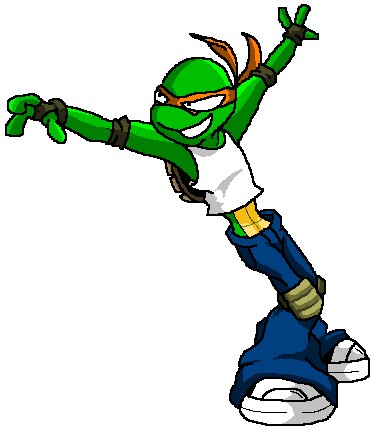 Michaelangelo is dancing (he seems to have a sort of Bart Simpson aura to him here)
