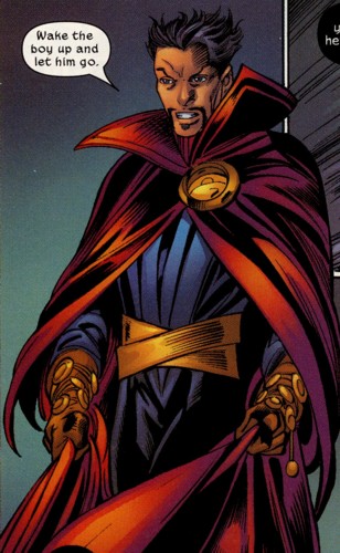 Stephen Strange Jr. is the son of Earth's undisputed master of the mystic arts. The elder Stephen Strange was a brilliant but arrogant surgeon until his drunk driving killed his wife and unborn son; the accident also injured his hands, ending his surgical career. Searching the world for a cure, he followed rumors to the Himalayan home of the Ancient One, who taught him both sorcery and humility, and Strange became the Earth dimension's most powerful sorceror. Returning to civilization after the Ancient One's time on Earth ended, Strange settled in New York. He took on a servant, Wong (part of a long family line who served Masters of the Mystic arts), and a disciple, Clea, who later became Strange's wife. When Strange suddenly vanished, the pregnant Clea searched for him; she eventually gave up hope, abandoningmagic and raising her son to believe his father died in a car accident. When that son turned 21, though, Wong told him the truth about his father. Wong tutored the new Doctor Strange in the mystic arts, using the Ancient One's texts; he displayed a natural aptitude, mastering the basics within a year.