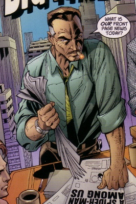 J. Jonah Jameson began his journalism career as a teen copy boy at the Daily Bugle; at 18, his editor let him accompany reporters on assignment to learn more about the newspaper business, experience that nurtured Jameson's love of the news industry. He rose rapidly through the Bugle's ranks, eventually becoming editor-in-chief and hiring editor Robbie Robertson as his right-hand man, co-workers for twenty years, Jameson values Robertson's expertise, but he also recognizes that Robertson's legendary cool-headedness can often be a vital foil for his own impulsiveness. In recent years, Jameson, now Bugle publisher, was horrified when his astronaut son was lost during a mission on the space shuttle Orion; the authorities had few answers for Jameson, citing only "technical manifunction" and unable to provide him a body to bury. Grief weighed heavily on Jameson, and when, some months later, the adventurer Spider-Man debuted, Jameson briefly resented the costumed cut-up for winning instant recognition and, among some, dedication, while his son lay dead and forgotten. Nevertheless, news was news, and Jameson offered a high price for anyone who could bring the Bugle a photograph of the mysterious Spider-Man; the call was answered by teenager Peter Parker, who provided Jameson with the sought-after photo; impressed by the boy's technical know how, the publisher hired him as a part-time web designer, unaware Parker was in fact Spider-Man. Robertson and top reporter Ben Urich grew concerned over Jameson's growing obsession with "debunking" Spider-Man's heroic reputation, although hardly as concerned as Parker.