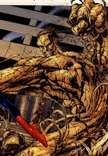 After Spider-Man apprehended Octopus, S.H.I.E.L.D. agents Woo and Carter arrived at the lab and found some surviving technicians hinding within. Carter carelessly freed Marko, who went on a rampage before Spider-Man intervened. Attacking both Spider-Man and the S.H.I.E.L.D. agents, Marko was slowed down went Spider-Man used a hose to mix water with his granular form, then was knocked out by one of the lab technicians using an experimental gun designed to stun him; Marko was taken into S.H.I.E.L.D. custody. Housed in the same top secret cell block as Norman Osborn, Doctor Octopus, Electro and Kraven, Marko escaped alongside of them. When the Ultimates raided Kraven's production company, the escapees took advantage of the situation and kidnapped Spider-Man from S.H.I.E.L.D.'s protective custody, with Electro and Sandman causing most the damage. Osborn then tricked an unmasked Spider-Man into joining their attack on the White House by threatening his Aunt May, but when they reached their target, they were intercepted by the Ultimates. Mrko attacked Iron Man, but was hit by a laser which caused him to explode. The clumps of Marko's sand form were later housed in separate jars in S.H.I.E.L.D. custody.