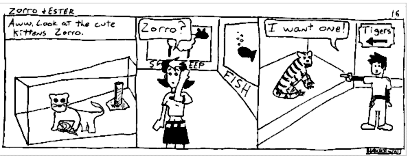 12601 - Working on a few (15) plays right now so I am quite busy. Perhaps sometime tomorrow or this weekend I'll put up the rough draft of one of them. Umm, My BurgerKing Collection of the Lord of the Rings figures is almost half done. I go once a day to get a new figure. Heh, I'm obsessed. Today's comic (16) was terrible. I can't draw cats of any kind. Basically I'm just putting off comics to make his actual choice happen on monday, and therefore people wait all weekend to find out what he gets. You know what? I think I'm gonna make a place to put these rants, cause I doubt people read them, but I enjoy writing them. Umm, what else. Ahh, yes, people do seem to enjoy guessing what animal he will end up buying. Some say Parrot, some clam, others llama, and so forth. So I'm glad I have those three fans, even though I was the one that guessed llama. heh. Time to end again, I've decided from now on I'll end with a Mitch Hedburg quote: "I hate flossing, I just wish I had one long curvy tooth, it didn't need to be split up. They didn't have to make separations with me. But then if my tooth falls out..."