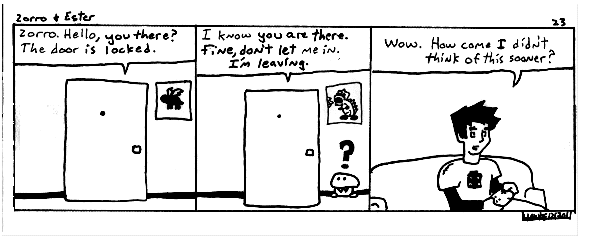 The previous secretary has been smacked and kicked off this rant writing forever. The last two sentences that sound just plain dumb were not dictated by me. Moving on. The comic today I especially liked, but not as much as yesterday's, since no one got it. Next up, a tribute to the greatest stuff ever, since that is the day which everything good happens, if that makes sense, which it doesn't. I have a friend who's a juggler, if I go to his house, I can't take things from him if he has only three left. Only three apples left, I guess I can't have one.