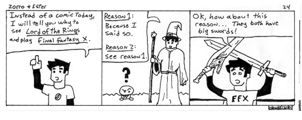 121801 - Well, I have finally hit 24 episodes. That is pretty good. Now, before the 25th one goes up, get ready to wait a few days. Tomorrow I have my last exam, calculus in fact, and then rush home from school to see Lord of the Rings twice in a row and pick up and play Final Fantasy X. So no one will be seeing much of me, either outside in the real world or on this website. Not that many people saw me in the real world anyways, but there will be even less me sightings. I am very excited about tomorrow, and it is hurting my studying. Please someone tell me that it is not just me, but everyone is looking forward to tomorrow as much as me. The 25th comic is not done, and has not even been written, but I'll tell you that it WILL be worth the wait. And the rant will be long and worth it. No more stupid rants. Never. Wait, all my rants are stupid, that is right. Whoops, my bad. I advertised my website on RPGamer yesterday, so my hits have doubled. That was pretty cool, now I have 400 people. That makes me rather happy. Even though it is still a rather small number. Well, I guess I should study SOME calculus, so I better be going. This was supposed to be a short rant anyways. I think that from now on I will end my rants not with Mitch, but with something original. I'm getting tired of trying to remember his quotes. My vote is that this is a good rant ender. Or a bad one, depending on your views... Here goes.... Holy Flying Toilet Paper Batman! That Joker just rolled our Batcave!