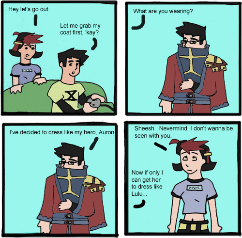1202 - Alright wow look at me, 2 updates in 3 days! That is impressive, and today's comic should be impressive too, as it is the first REAL Zorro and Ester comic in color, since number 25 was just a practice to figure out the program I got. Well, I got in the mood for drawing and so decided to figure out the program, which I did pretty well. I enjoyed today's comic, but one needs to have played, or at least seen the characters from Final Fantasy X to understand. I hate making comics some people don't get, but I feel that my comics need to have more RPG influence in them, so if you don't get the comic, go play the RPG that corresponds to it to get the joke. That way everyone is happy.
