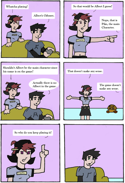 1402 - Here is the new comic. Yesterday was fun for I went sleding which hurt a lot but was fun. It felt like a Calvin and Hobbes comic for I hiked into the woods and flew down a hill hitting lots of trees on the way. I also twisted my ankle badly so I can't walk right. I am redoing a lot of old pictures from 1997 and cleaning up them and coloring them with photoshop so I will have to soon make another section to show them off on the web, which I will do shortly. Today's comic is only funny to me, one friend of mine, perhaps his brother, and the people who made Albert's Odyssey at Working Designs, for I think they realize how bad of a game it is too. The sad thing is I just bought a Saturn to play it. Yeah. I made a big vampire snowman today and drew and colored a lot of pictures. End.