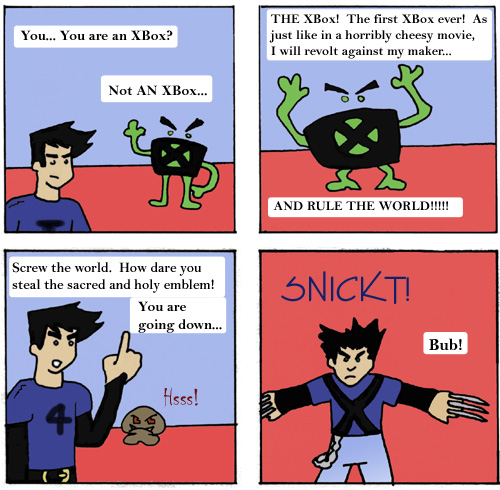Oh, and I should mention, since most people wouldn't understand this comic or anything, it is a refrence to Wolverine. From the X-men. X men. With an X. And he is getting angry that the X box steals the X from the X men. Or something. Basically I just wanted to draw Zorro as Wolverine. And yes that is Zorro in the last panel, if anyone thought differently I am sorry. I styled his hair differently so that he looks more like Wolverine. As if the claws were not a dead giveaway. And the "Bub!" And the X on his shirt. Remember, Zorro's shirt changes designs randomly, so don't expect it to be the same from panel to panel.