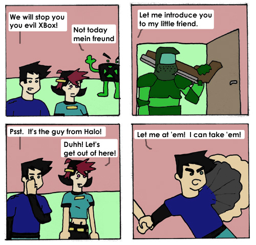 2202 - Hmmm... Had something interesting to say, but at this time at nite I don't quite remember. Oh well, it'll come to me tomorrow. I'm sorry the comic isn't funny enough today, but I needed to get them out of there so we can have some funny ones. And by the way, in case you didn't notice, they escape from the XBox and the halo soldier at the end. The Halo soldier is to represent the only (supposedly but I don't think so) good game for the XBox. Besides Jet Grind (Set) Radio Future of course.