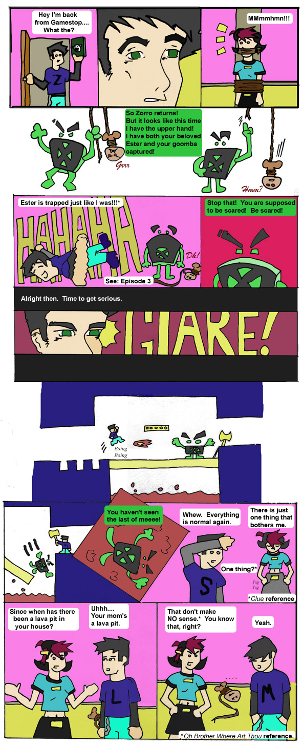I hope the comic is understandable. It refrences other episodes, like the first and third. But I put in an editor's note to see episode 3 where Ester tied up Zorro, so I hope everyone understands that and all. Oh yeah, and that whole scene of Zorro jumping and grabbing the axe, well, if you don't recognize it is from Mario, then I don't know what to say. I tried my hardest to make it obvious. Oh well.